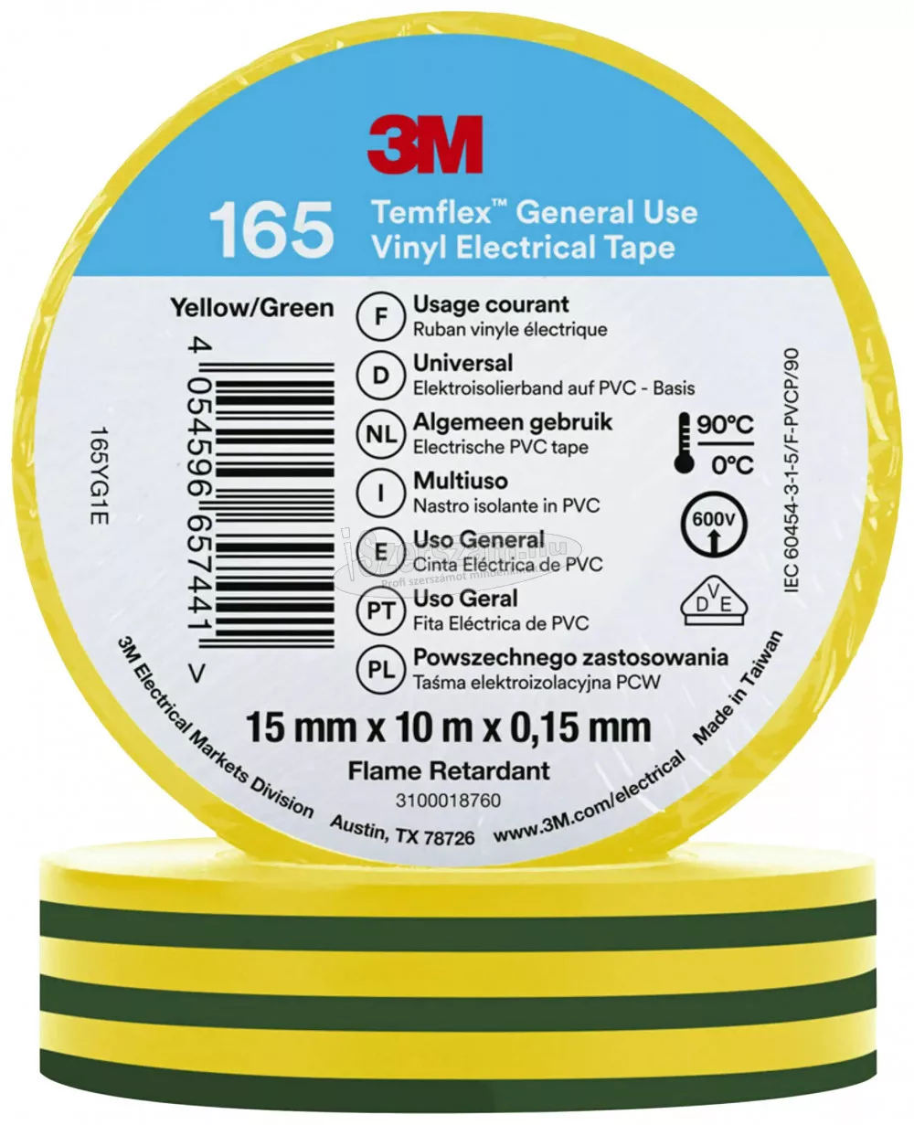 3M™ Temflex™ vinil elektromos szalag 165, zöld/sárga, 15 mm x 10 m. A 3M™ Temflex™ Vinyl Electrical Tape 165 egy 0,15 mm vastag, professzionális minőségű PVC elektromos szalag beltéri és kültéri használatra. Használjon 3M™ Temflex™ 165 vinil szigetelőszalagot az elsődleges szigeteléshez, a vezetékek és kábelek (alacsony feszültségű) javításához és kötegeléséhez. Ez a professzionális szalag jobb teljesítményt nyújt, és beltéri és kültéri használatra is alkalmas. Ez a szöveg gépi fordítással készült. Főbb jellemzők: Sárga. (H x Sz) 10 m x 15 mm. Öntapadó, Univerzálisan használható. Kivitel: Jó kopásállóság, lúgok, savak és sokféle időjárási viszony - beleértve a napfényt is. Nagy elektromos szilárdságot biztosít. Nagy teljesítményre tervezték akár 90°C-os környezeti hőmérsékleten. Professzionális szalag beltéri és kültéri használatra. Szabványos ipari színekben kapható. VDE tanúsítvánnyal rendelkezik, IEC 60454-3-1-5/F-PVCP/90. Égésgátló.