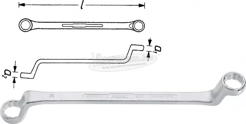 Kettős csillagkulcs, laptáv: 18 mm, laptáv: 19 mm. Mélyen derékszögben eltolva.