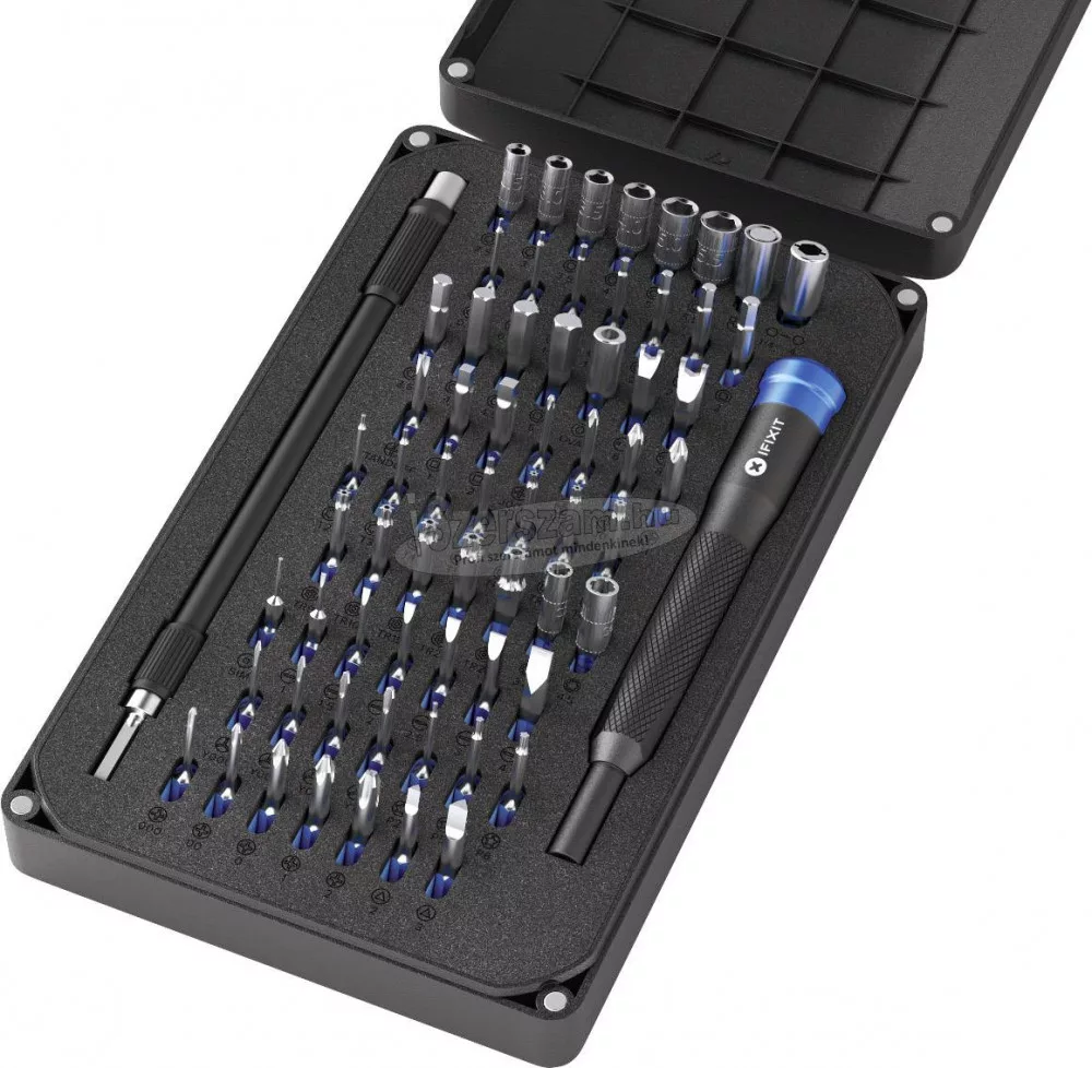 Bit készlet okostelefon szereléshez, 64 részes, Driver. A teljes megoldás minden olyan csavarozáshoz, amely nagy pontosságot igényel. 64 bit - többezer szerelési útmutató szerelési adatai alapján lettek összeállítva. Ez a készlet speciális biteket tartalmaz okostelefonok, játék konzolok, viselhető készülékek, laptopok, asztali számítógépek, tabletek és egyéb szórakoztató és háztartási elektronikai készülékek javításához. Speciálisan kialakított házában egy nagy sűrűségű habszivacs betét van, amelyben a bitek és a szerszámok áttekinthetően vannak elrendezve. A fedél belső oldalát csavarok és apró alkatrészek szortírozására lehet használni. Az ergonomikus kialakítású fogantyúja biztos fogás mellett nagy nyomatékot tesz lehetővé, a golyóscsapágyazott forgatható kupak és a mágneses bit tartó mind segítik a precíz munkát. Szállítás: Mágneses 4 mm-es csavarhúzó, golyóscsapágyazott forgató sapkával. Hajlékony tengely hosszabbító hossza 150 mm. Kereszthornyú Phillips, PH 000/PH 00/PH 0/PH 1/PH 2. Egyenespengéjű, 1/1.5/2/2.5/3/4 mm. Torx T2, T3, T4, T5. Torx Security TR6, TR7, TR8, TR9, TR10, TR15, TR20, TR25. Pentalobe P2, P5, P6. JIS J000, J00, J0, J1. Blső hatlap nyílású, 0.7/0.9/1.3/1.5/2/2.5/3/3,5/4/5/5.5 mm. Tri-point Y000, Y00, Y0, Y1. Belső hatlap dió, 2.5, 3, 3.5, 4, 4, 5, 5.5 mm. Négyzet #0, #1, #2. Gamebit, 3,8/4,5 mm. Csavarkulcs, 4/6/8. Háromszög, 2/3 mm. Standoff bit iPhone-hoz. Oval Drive. Mágneses felvevő bit. SIM Eject szerszám. Adapter 4 mm-ről 1/4"-ra.
