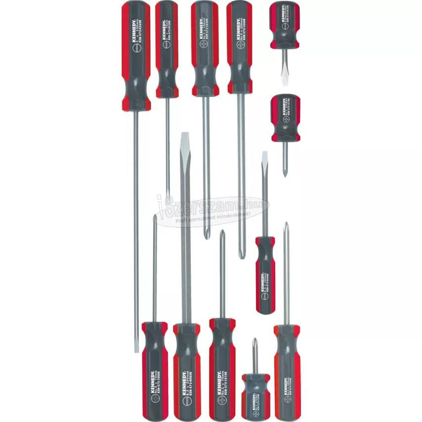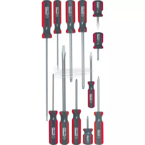 KENNEDY 12 DB-OS IPARI CSAVARHÚZÓ KÉSZLET KEN5725940K. Hagyományos ‘hornyoltő markolat. Selyemfényű, edzett és köszörült króm ötvözetből készült penge. Ez a csavarhúzó típus nyújtja a legszélesebb választékot. Olaj-, sav- és ütésálló műanyag markolat.