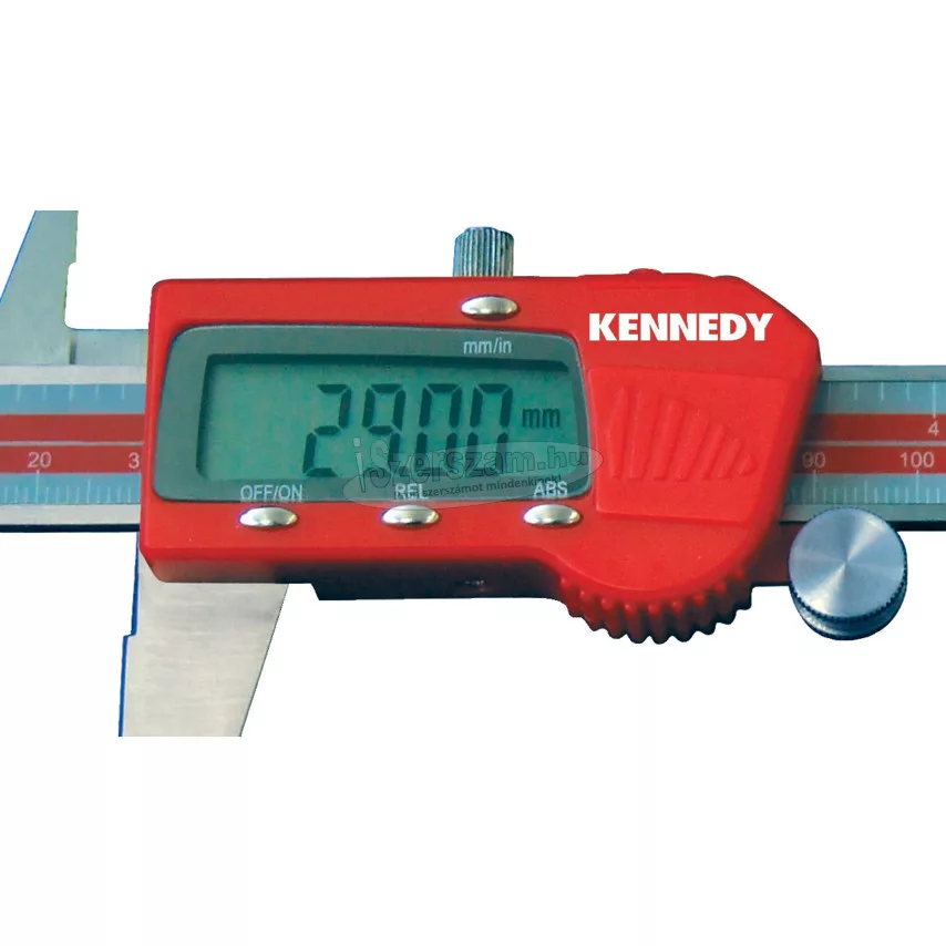 KENNEDY 12"/300mm DIGITÁLIS TOLÓMÉRŐ KEN3312320K. Korszerű megjelenés, pontos mozgatás recézett dörzskerékkel. Könnyen használható külső és belső átmérő, valamint lépcső mérésekhez. Kettős leolvasás, gombnyomásra átváltható inch/metrikus érték. Nullpontbeállítás bármely állásban, nagyméretű kijelzőszámok, hibamentes működés, gyors reakcióidó. Leolvasási pontosság 0.01 mm/0.0005"