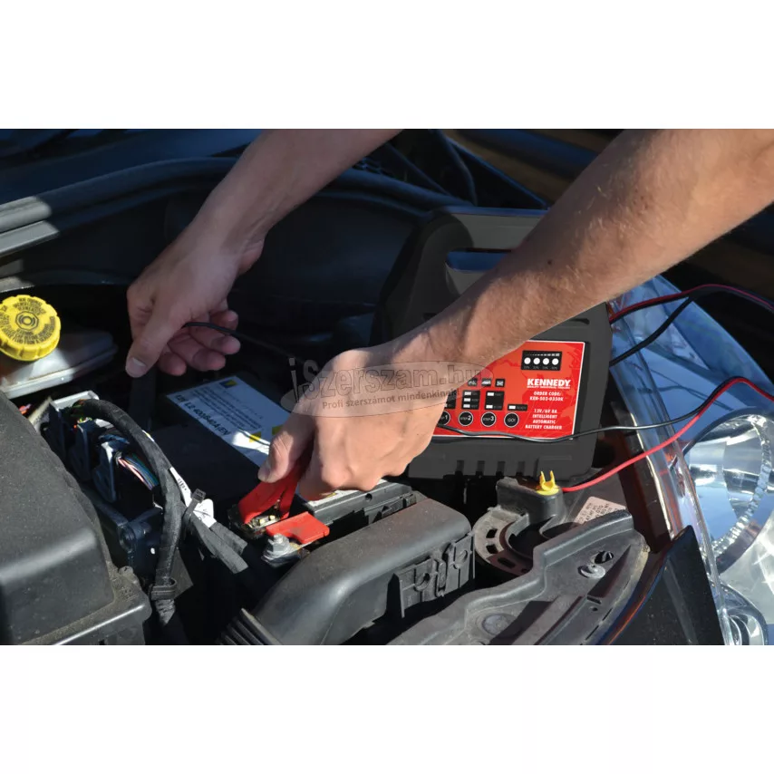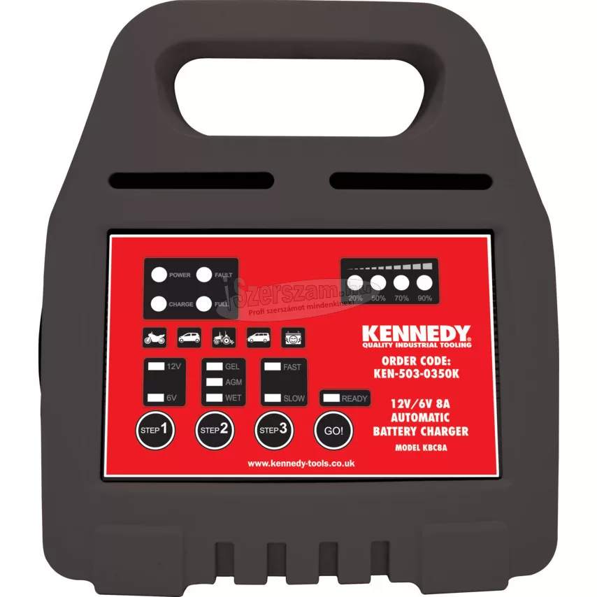 KENNEDY 12V/6V 8A AUTOMATIKUS AKKUMULÁTORTÖLTŐ KEN5030350K. Robusztus töltő otthoni vagy könnyű garázsipari használatra. Egyszerű és könnyű használat. LED kijelző. SZÁRAZ, AGM és GEL típusú akkumulátorokhoz. Optimalizált töltési program. Hatékony, 3 lépcsős töltés. Teljes mértékű teljesítmény-leadás. Könnyű és hordozható. Intelligens áramkör-ellenőrzés és védelem.