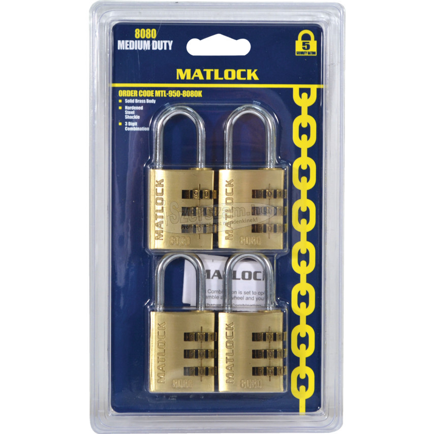 MATLOCK 30mm KOMBINÁCIÓS RÉZLAKAT (PK-4) MTL9508080K. A Matlock masszív sárgaréz lakatok minimális és közepes szintű kültéri és beltéri biztonságot nyújtanak, garázsokon, szekrényeken, szerszámosládákon, kapukon, tehergépkocsi ajtókon, üzleteken, kerékpárokon stb. Különböző méretekben áll rendelkezésre, a Matlock sárgaréz lakatok sárgaréz vázzal és megerősített acélból készült lakatkengyellel rendelkeznek, 3 vagy 4 számkombinációval.