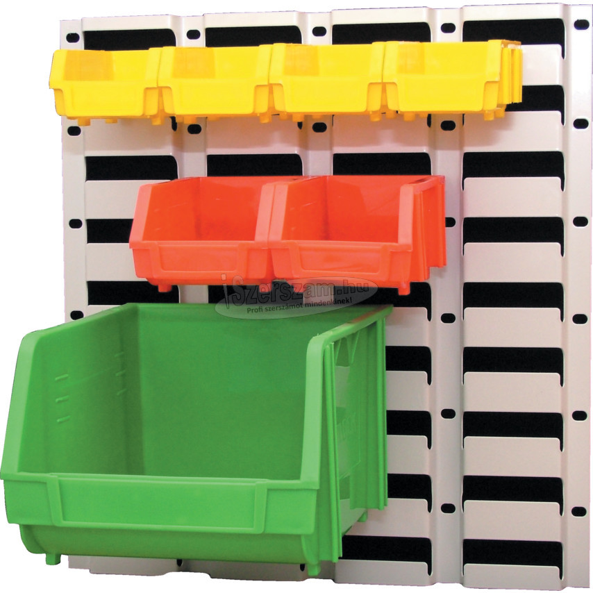 MATLOCK MTLP18 FÜGGESZTŐ PANEL MTL4042018P. Acél függesztő panelek Sajtolt acél panelek sűrűn kialakított függesztőrésekkel, melyek lehetővé teszik a legtöbb féle műanyag tárolódoboz rögzítését. A dobozok szín és méret szerint tetszőleges konfigurációban, jó helykihasználással helyezhetők el, szükség esetén könnyen cserélhetők, áthelyezhetők. Tárolódobozok külön szerezhetők be.