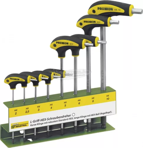 L fogantyú csavarhúzó készlet 2 - 10 mm 8 részes. Sokoldalú tartóval, műhely használatra. Jól látható méret megadással a fogantyún az áttekinthető tároláshoz. Szállítás: Laptáv: 2/2,5/3/4/5/6/8/10 mm. Tartó.