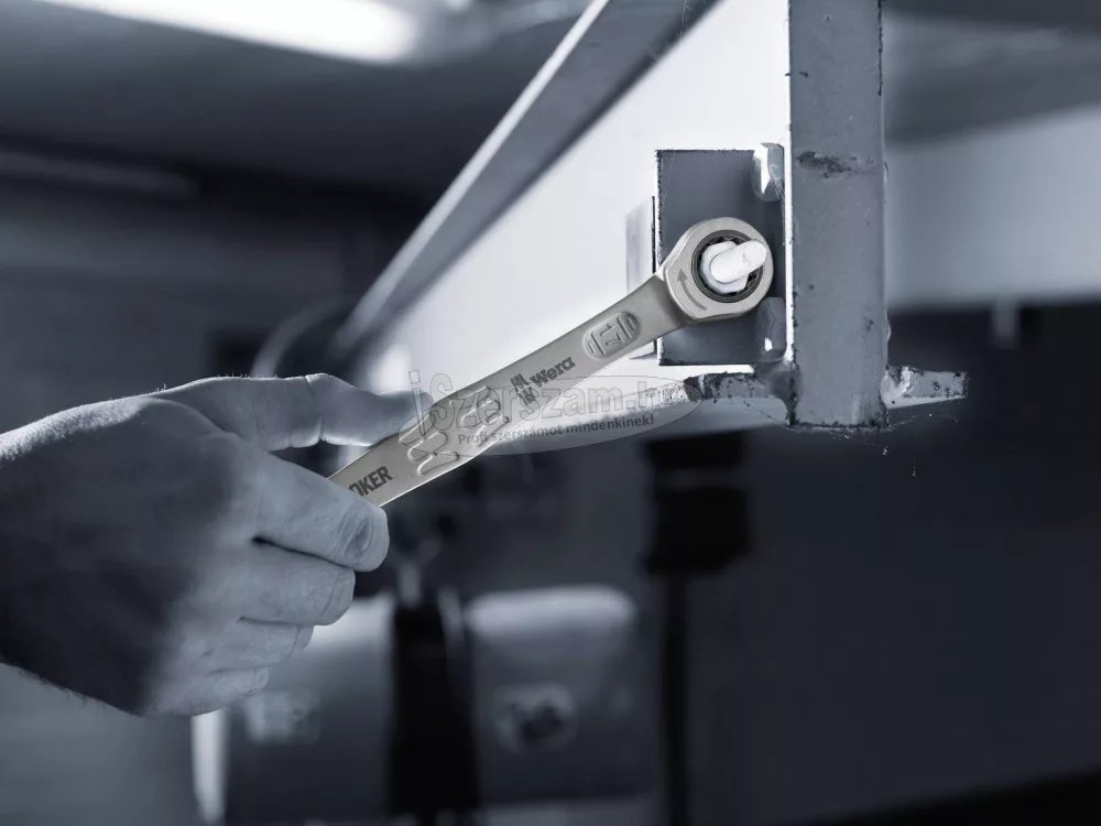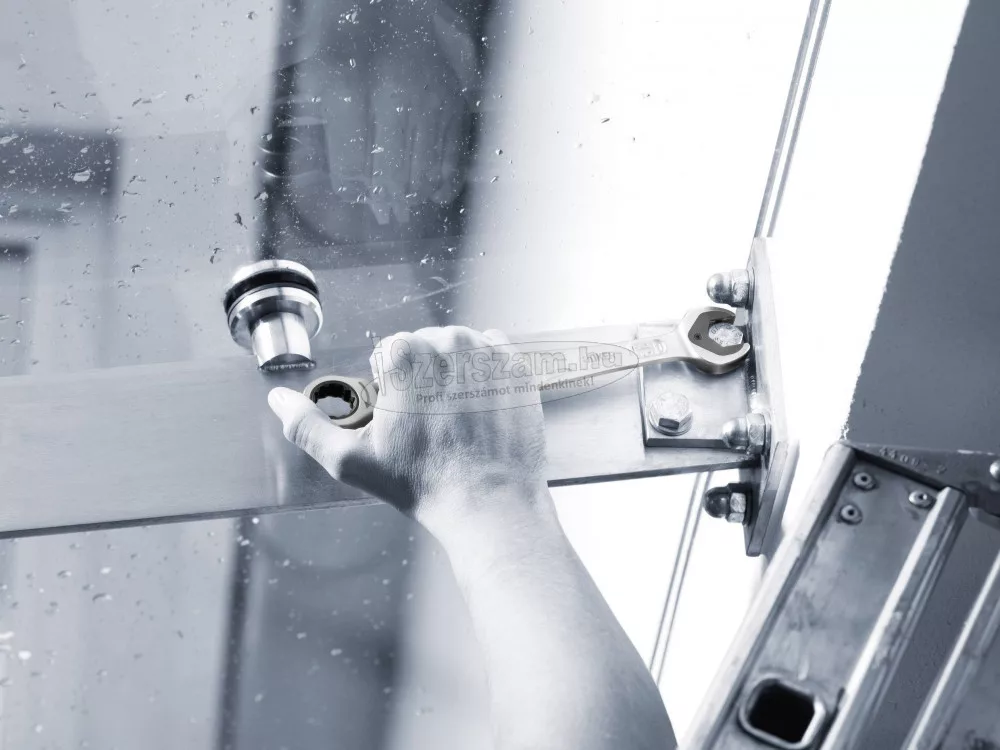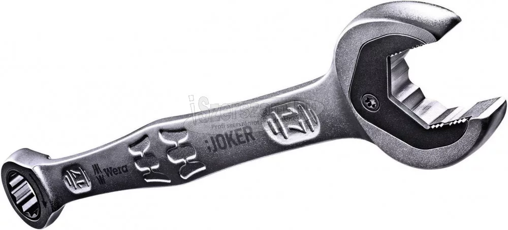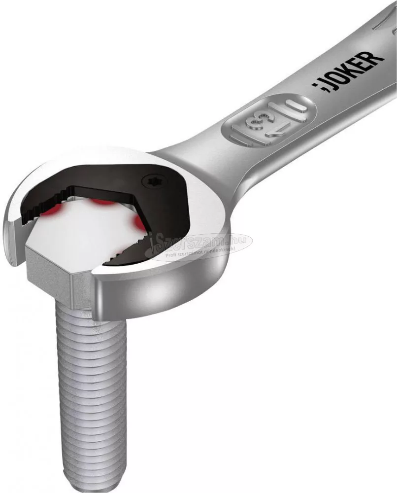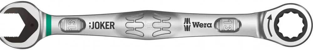 Villás- és racsnis gyűrűs kulcs Joker, 13 kulcsnyílás. Minden elképzelhető helyzetben a Joker gyorsan és precízen oldja meg a csavarozási feladatokat. A gyűrűs oldal racsnis mechanikája különösen finom, 80 fogas fogazású, ezért rugalmasan használható szűk helyeken. A speciális kovácsolási geometria, kombinálva a jó minőségű króm-molibdén acéllal és a nikkel-króm bevonat három pontban teszi igen előnyössé, ezek: az igen hosszú élettartam, a nagy kopásállóság és a tartósan magas fokú korrózióvédelem. Főbb jellemzők: Praktikus tartó funkció, a pofájában lévő fémlapnak köszönhetően. Biztonságos csavarozás nagy forgatónyomaték esetén is. Kivitel: A pofában lévő lemez megtartja az anyát. Integrált végkitérés. Kettős hatlap geometria. A nagyfokú korrózióvédelemhez nikkel-króm bevonat. A racsninak csekély a játéka. Nem csúszik le.