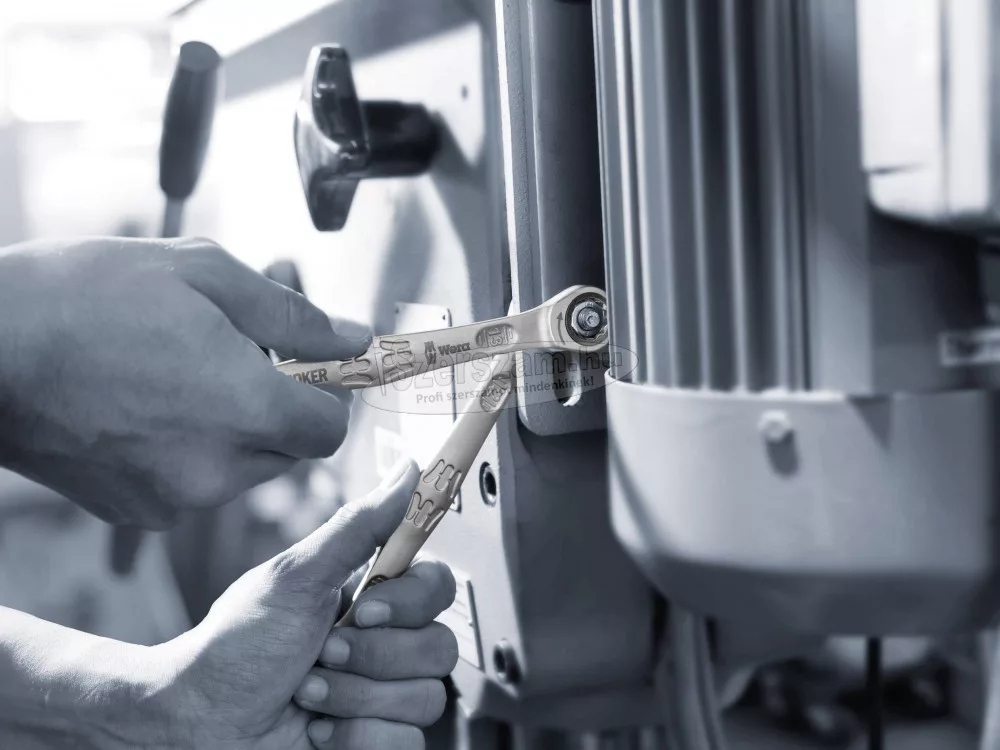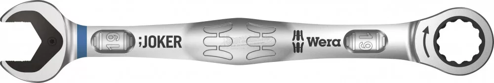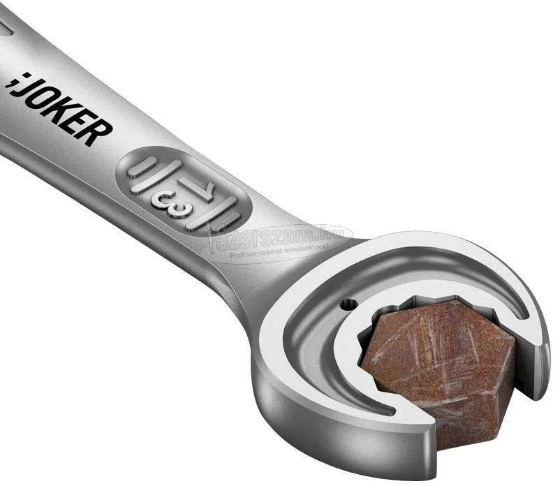Villás- és racsnis gyűrűs kulcs Joker, 19 kulcsnyílás. Minden elképzelhető helyzetben a Joker gyorsan és precízen oldja meg a csavarozási feladatokat. A gyűrűs oldal racsnis mechanikája különösen finom, 80 fogas fogazású, ezért rugalmasan használható szűk helyeken. A speciális kovácsolási geometria, kombinálva a jó minőségű króm-molibdén acéllal és a nikkel-króm bevonat három pontban teszi igen előnyössé, ezek: az igen hosszú élettartam, a nagy kopásállóság és a tartósan magas fokú korrózióvédelem. Főbb jellemzők: Praktikus tartó funkció, a pofájában lévő fémlapnak köszönhetően. Biztonságos csavarozás nagy forgatónyomaték esetén is. Kivitel: A pofában lévő lemez megtartja az anyát. Integrált végkitérés. Kettős hatlap geometria. A nagyfokú korrózióvédelemhez nikkel-króm bevonat. A racsninak csekély a játéka. Nem csúszik le.