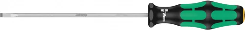 335 0,6 x 3,5 x 125 mm Slotted Schr.-Dr. Minőségi Kraftform Plus csavarhúzó, Wera. Többkomponensű Kraftform markolat. Lasertip hegyek: Microdurva felület, amely a csavarfejbe harap. Ezáltal kevesebb a félresiklás, kevesebb erőkifejtés szükséges. Hatlapú gördülés védelemmel az elgurulás ellen. Markolatjelölés a szerszámok könnyebb megtalálása és rendszerezése érdekében. Ez a szöveg gépi fordítással készült. Főbb jellemzők: N/A. Lasertip. Kraftform elgurulás elleni védelemmel. Kivitel: A Kraftform Plus csavarhúzó nagyobb erőátvitelt tesz lehetővé kisebb erőkifejtéssel, és megkíméli az egész kéz-kar rendszert – tartós igénybevétel mellett is. A kiválóan kézbe illő Kraftform markolattal elkerülhetők az olyan sérülések, mint a hólyagképződés vagy bőrkeményedés. A markolathoz használt kemény anyagok (fekete markolati részek) gyors fogást biztosítanak anélkül, hogy a bőrhöz tapadnának. A lágyabb " csúszásmentes" részek (zöld) lehetővé teszik a nagyobb erőkifejtés veszteségmentes átvitelét. A csavarprofilt és profilnagyságot megadó markolatjelölések megkönnyítik a csavarhúzók megtalálását a szerszámos táskában vagy a munkaasztalon. A hatszögletű hengervédő megakadályozza a bosszantó gördülést a munkahelyen. - Hogyan lehet megakadályozni, hogy kicsúszjon a csavarfejből? Újra és újra előfordul, hogy a csavarozáskor kicsúszik a csavarból. Ilyenkor esetleg még feszültség alatt álló alkatrészek közé is kicsúszhat. A Wera Lasertip csavarhúzók hegye lézersugárral mikroszkopikusan fel van durvítva. Ez a durva felület formálisan szilárdan " berágja" magát a csavarfejbe. Ez biztonságérzetet kelt, különösen, ha feszültség alatt dolgozunk. A lézer kezeléssel a pengehegybe egy mikrodurvaságú, szélső értékben 1000 Vickers keménységű felületet égetnek be. Ez formálisan szilárdan berágja magát a csavarfejbe. Előnye: kevésbé csúszik, nagyobb biztonság. A csavarhúzókészletek mindig falhoz rögzíthető állványokkal vannak ellátva. Így rendesen vannak tárolva és gyorsan hozzáférhetőek. Szállítás: 335 0,6 x 3,5 x 125 mm.