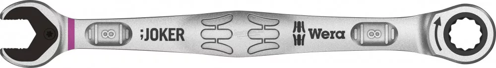 racsnis csillag-villáskulcs Joker. A Joker minden elképzelhető helyzetben gyorsan és precízen oldja meg a csavarozási feladatokat. A gyűrűs oldal racsnis mechanikája különösen finom fogazású, 80 foggal, ezért rugalmasan használható szűk helyeken. A speciális kovácsolási geometria, kombinálva a jó minőségű króm-molibdén acéllal és a nikkel-króm bevonat három pontban teszi igen előnyössé, ezek: az igen hosszú élettartam, a nagy kopásállóság és a tartósan magas fokú korrózióvédelem. Főbb jellemzők: Praktikus tartó funkciót biztosító fémlemezzel a pofában. Nincs szükség a kulcs átfordítására. Biztosan meghúzott csavarok, még nagy nyomatéknál is. Kivitel: Praktikus tartó funkciót biztosító fémlemezzel a pofában. Beépített végállás felütközéssel. Kettős hatlapú geometriával. Nikkel-króm korrózióvédő bevonattal. Igen kis lépésszöggel. Nem csúszik le.