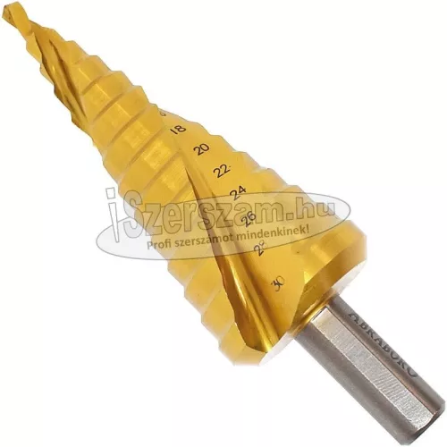 Lépcsős fúró nagy felületkeménységet biztosító Titán-Nitrid bevonattal.