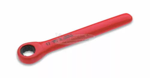 Ratchet gyűrű csavarkulcs 13 mm. Króm-vanádium acélból készült, a DIN 3110 / ISO 3318 (nyomaték) szerinti 1000 V-os racsnis csavarkulcs. Ratchet mechanizmus finom fogazással (72 fogak) és 5 ° visszaszállási szög (lábszög). A jobb és a bal forgás úgy érhető el, hogy egyszerűen elfordítják a kulcsot, szélessége 13 mm, a tömeg 80 g.
