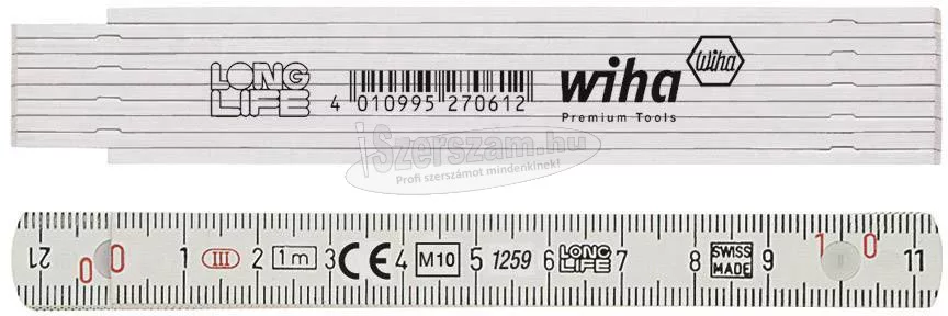 Műanyag colstok, Longlife®. Kivitel: SWISS-Made, fehér színű, fekete osztással és piros mm jelzéssel. Szabadalmaztatott csuklórendszer, minden csukló 90° -os rácsozattal, ezért nagyon flexibilis.