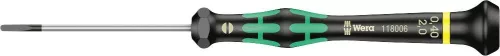 Elektronikai csavarhúzó, 0,40 x 2,0 x 60 mm. Kiváló minőségű Wera Micro csavarhúzó a finom mechanikus csavarkötésekhez. A forgatható kupakon a kéz könnyen megtámasztható, az alatta lévő gyors csavarozási zóna pedig villámgyors csavarozást tesz lehetővé. Hatékonyságot növelő markolat kialakítás. Az erőátviteli zóna beépített lágy zónákkal gondoskodik a nagyobb húzó-és oldó nyomaték átviteléről. Precíziós zóna a finombeállítási munkáknál a megfelelő forgási szöghöz. A Wera Black-Point hegy illeszkedési pontosságot és optimált korrózió elleni védelmet kínál. Ez a szöveg gépi fordítással készült. Kivitel: Fekete Pont hegyével.
