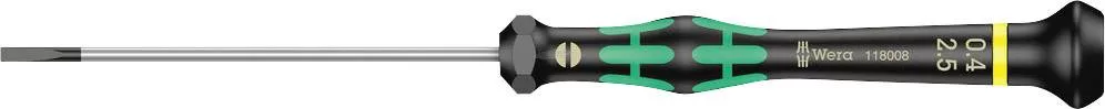 Elektronikai csavarhúzó, 0,40 x 2,5 x 80 mm. Kiváló minőségű Wera Micro csavarhúzó a finom mechanikus csavarkötésekhez. A forgatható kupakon a kéz könnyen megtámasztható, az alatta lévő gyors csavarozási zóna pedig villámgyors csavarozást tesz lehetővé. Hatékonyságot növelő markolat kialakítás. Az erőátviteli zóna beépített lágy zónákkal gondoskodik a nagyobb húzó-és oldó nyomaték átviteléről. Precíziós zóna a finombeállítási munkáknál a megfelelő forgási szöghöz. A Wera Black-Point hegy illeszkedési pontosságot és optimált korrózió elleni védelmet kínál. Ez a szöveg gépi fordítással készült. Kivitel: Fekete Pont hegyével.
