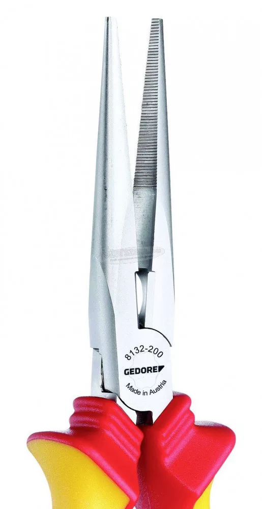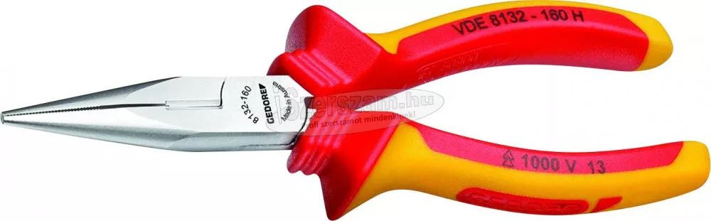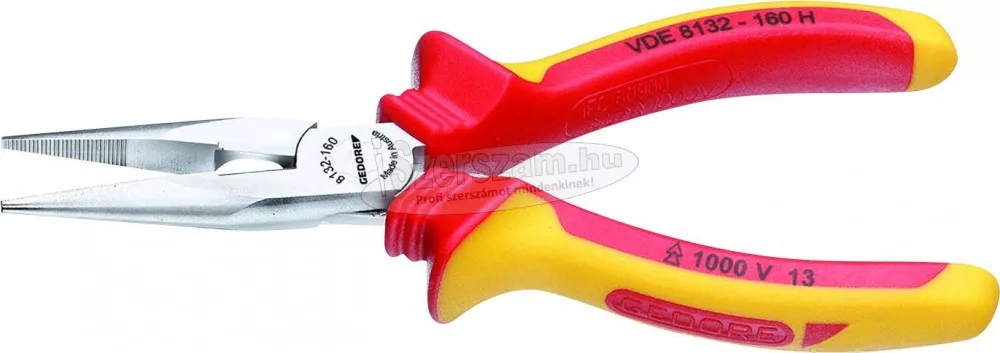 VDE tűfogó hüvelyszigeteléssel, egyenes. Lapos kerek, hosszú pofák, egyenes fogófelületek, fogazott Tartási, megfogási, hajlítási és vágási munkákhoz Indukciósan edzett precíziós vágóélek, vágóél keménység 61 - 63 HRC GEDORE speciális edzett és edzett acél, csepegtetett, olajjal edzett és edzett A VDE láb 1000 V -ig szigetelt, az EN 60900 / IEC 60900 szerint, hüvelyszigetelés