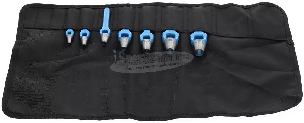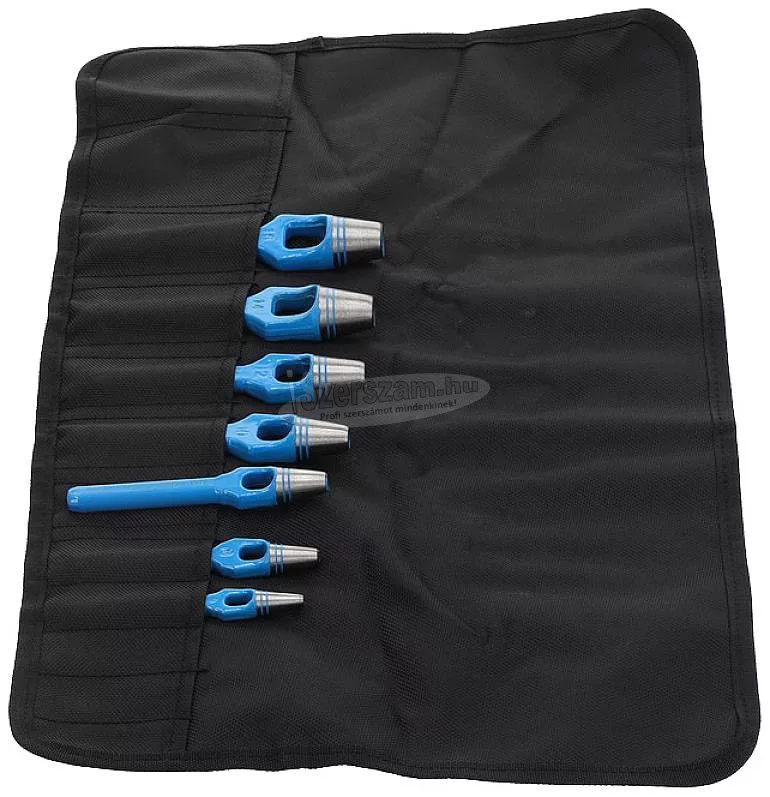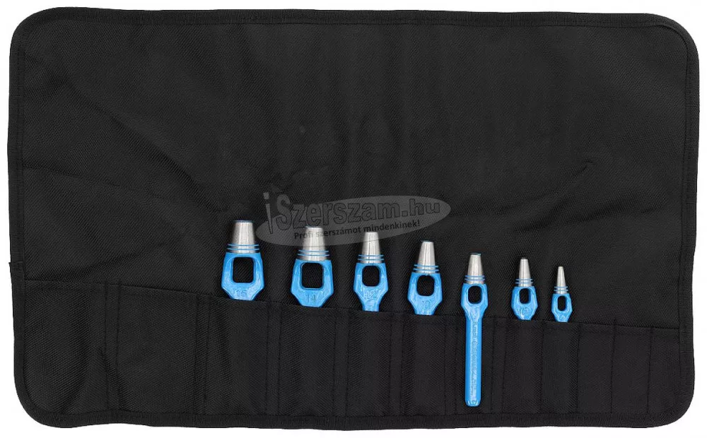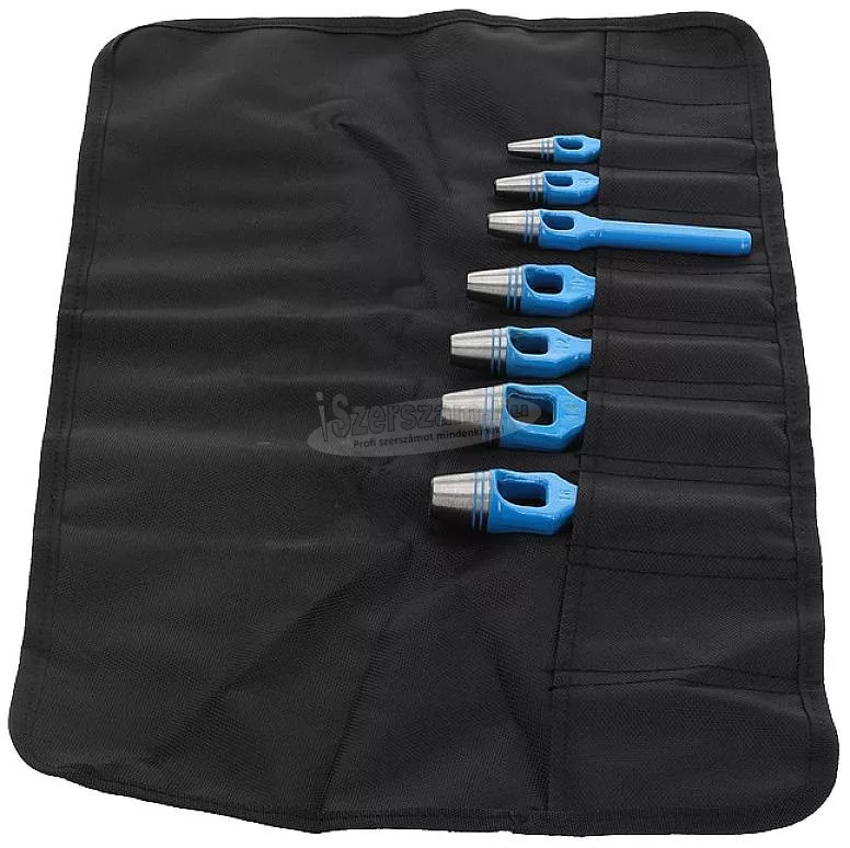 570307 - GEDORE - Lyukasztó készlet, 7 db 4-16 mm. Kivitel: A DIN 7200 A forma szerinti változat Karton, bőr, gumi, tömítőanyagok és más puha anyagok lyukasztására. Edzett vágóél, kék lakkolt tengely. Műanyag feltekercselő tokban. Ez a szöveg gépi fordítással készült. Szállítás: Lyukasztó készlet, 7 részes, 4-16 mm.