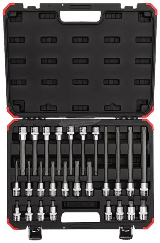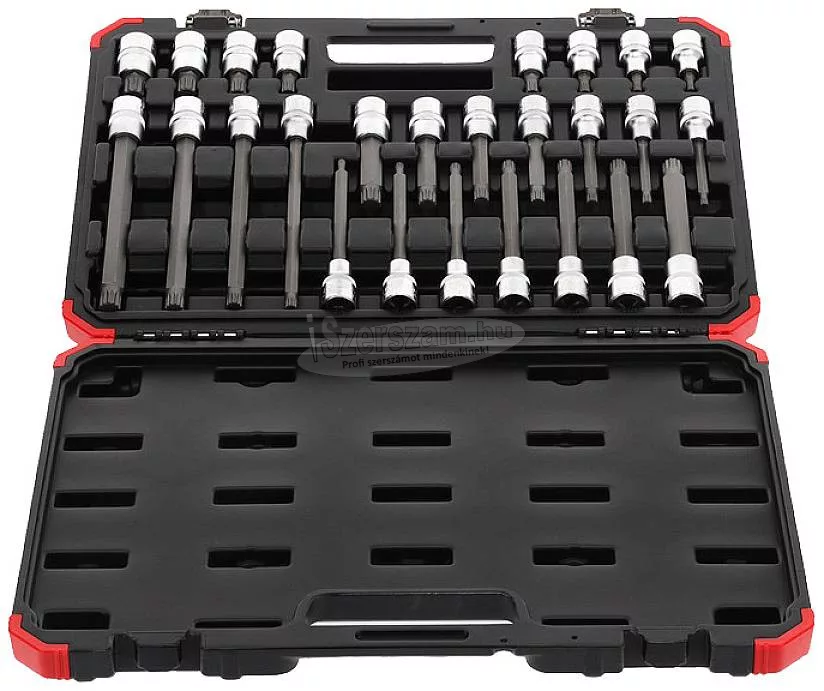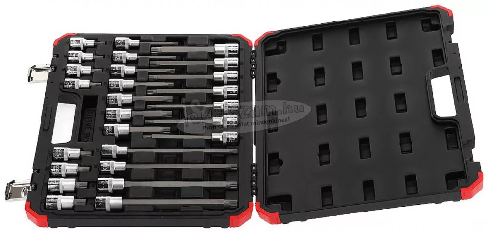 Csavarhúzó készlet, 1/2"XZN 26 darabos. Kivitel: Négyzetes hajtás a DIN 3120 - C 12.5, ISO 1174 szerint, gömbfogó horonyval. Csavarhúzó 1/2", XZN, behúzott, foszfált csappal, praktikus hosszanti gördítéssel, polírozott hajtóoldal. Króm-vanádium acél, matt szatén króm. Kézi működtetésű csavarozási esetekhez. Műanyag tok GEDORE piros kivitelben. Csavarral rögzített szerszámok. Fém zsanérok / -Lock.