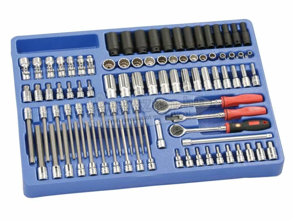 Geniu Tools - Canada 90 részes, 3/8"-os csatlakozású készlet. 13 db légkulcsfej 6 l.h.: 5/16, 11/32, 3/8, 7/16, 1/2, 9/16, 19/32, 5/8, 11/16, 3/4, 25/32, 13/16, 7/8" 14 db crowafej 6 l.h.: 1/4, 5/16, 11/32, 3/8, 7/16, 1/2, 9/16, 19/32, 5/8, 11/16, 3/4, 25/32, 13/16, 7/8" 14 db crowafej 12 l.n.: 1/4, 5/16, 11/32, 3/8, 7/16, 1/2, 9/16, 19/32, 5/8, 11/16, 3/4, 25/32, 13/16, 7/8" 7 db csuklós crowafej 12 l.n.: 3/8, 7/16, 1/2, 9/16, 5/8, 11/16, 3/4" 10-10 db imbusz bit hosszú (143mm) - rövid (48mm) : 1/ 8, 5/32, 3/16, 7/32, 1/4, 9/32, 5/16, 3/8, 7/16, 1/2" 10 db lyukas torx bit hosszú (143mm) : T10, T15, T20, T25, T27, T30, T40, T45, T50, T55 (143mm) 7 db 12 szögű (Spline) bit rövid (48mm) : M4, M5, M6, M8, M10, M12, M14 1 db racsnis kulcs 72fogú, hossz: 230mm 1 db forgó fejű racsnis kulcs 72fogú, hossz: 250mm 1 db csuklós hajtókar, hossz:23mm 2 db toldószár: 75 - 200 mm.