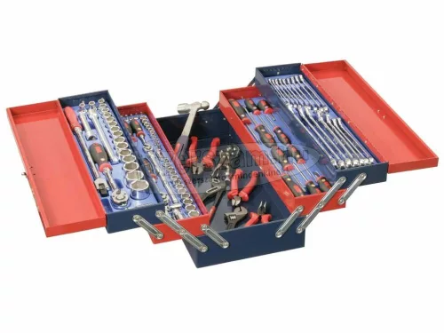 Genius Tools - Canada Harmónika kialakítású hordozható, profi szerszámos láda 110 db Genius szerszámmal együtt. A szerszámok átlátható módon 4 db ládában elhelyezett kék színű, masszív tároló tálcában vannak elhelyezve. Hordozható kétszárnyas szerszámosláda, 5 tároló rekesszel. Fogantyúval és rögzítő kapoccsal. Tartalom: 40 db dugófej 1/4"-es 4-13mm, 3/8"-os 8-19mm, 1/2"-os 10-32mm 2 db 3/8"-os gyertya dugófej: 1 db 16-os, 1 db 21-es 3 db crowa csukló: 1 db 1/4", 1 db 3/8", 1 db 1/2" 6 db crowa toldószár: 2 db 1/4" 50 és 100mm -es, 2 db 3/8" 75 és 150mm-es, 2 db 1/2" 125 és 250 mm-es 9 db gömbvégű, hosszított "L" alakú imbuszkulcs: 1,5 - 2 - 2,5 - 3 - 4 - 5 - 6 - 8 - 10 mm 18 db csillag-villáskulcs polírozott kivitelű: 6-7-8-9-10-11-12-13-14-15-16-17-18-19-20-21-22-24 mm 8 db hatlapú imbusz dugókulcs: 1/4"-es: 3-4-5-6-7-8-9-10 mm 4 db csavarhúzó philips kereszt: Ph0x75, Ph1x120, Ph2x125, Ph1x38 mm 4 db csavarhúzó lapos: 3.0x75, 4.0x100, 5.5x100, 6,5x38 mm 2 db üthető végű csavarhúzó: 1 db kereszt Ph1x100 mm, 1 db lapos 6,5x125 mm 1 db csavarhúzó a végén 1/4"-os csatlakozással crowa dugófejekhez. 3 db csuklós hajtószár: 1 db 1/4", 1 db 3/8", 1 db 1/2" 3 db gyors oldású, irányváltós racsnis kulcs: 1 db 1/4", 1 db 3/8", 1 db 1/2" 4 db fogó: 1 db 10"-os vízpumpa, 1 db 7"-os kombinált fogó, 1 db 6"-os laposfogó, 1 db 6"-os oldalcsípő fogó 1 db állítható kulcs: 0 - 24 mm, teljes hossz: 200 mm (8") 1 db patentfogó 7"-os (180 mm) Tartozék: 4 db hosszított kivitelű szerszámos ládához készült műanyag tálca. Tálca méretei: 530x125 mm Szerszámos láda mérete: Szélesség: 536 mm Mélység: 258 mm Magasság: 220 mm.
