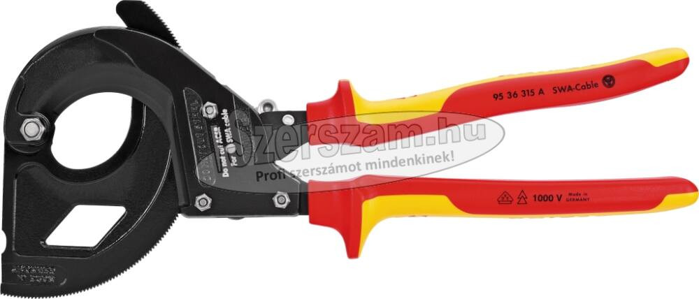 KNIPEX Szigetelt kábelvágó olló, racsnis, SWA kábelhez 315mm, d=45/380mm² 1000V, kétkomponensű nyél 9536 315A. Szigetelt kábelvágó olló, racsnis, SWA kábelhez, kétkomponensű nyél, 1000V, KNIPEX.
