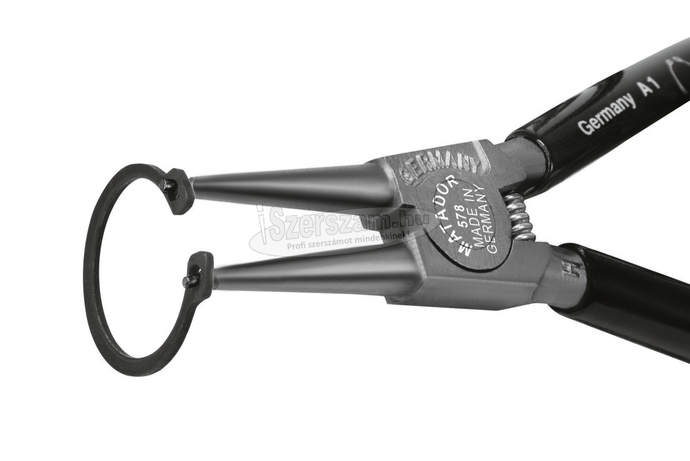 Csavarfogó, egyenes, DIN 5254, A, A4. Fogók a külső gyűrűkhez (A). Külső gyűrűk rögzítéséhez tengelyekre a DIN 471 és DIN 983 szerint. Erős, kovácsolt alak. Egyenes pofákkal és nyitó rugóval. Csúszásgátló, csavart precíziós tippek. Markolat műanyaggal bevonva. Törés- és csúszásgátló hegyprofil kovácsolt precíziós tippekkel.