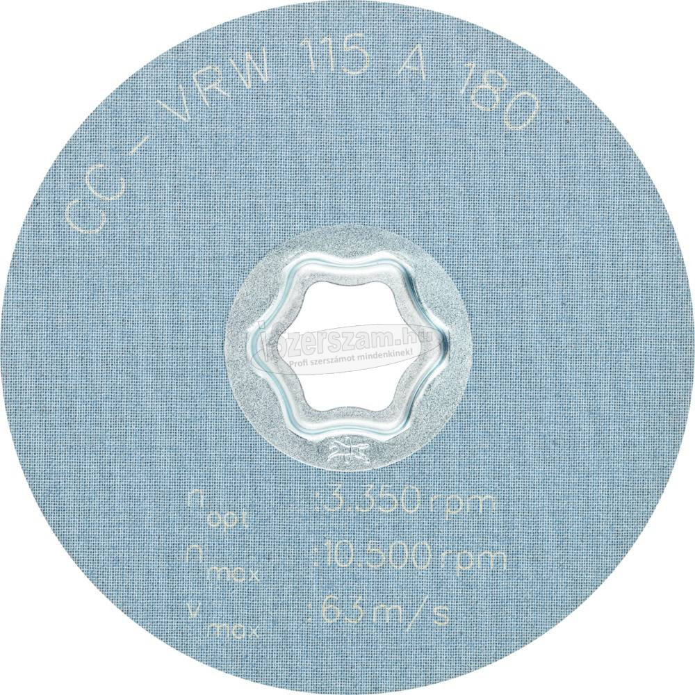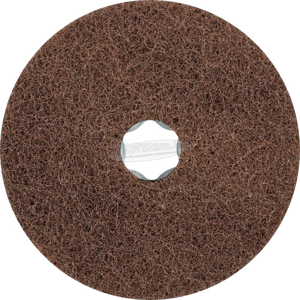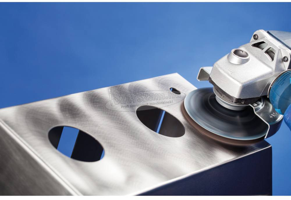 Szemcseméret: 180. Max. Fordulat / perc: 10500 / perc. Optikai, Fordulatszám: 3300 RPM. Csiszolóanyagok: A. Megmunkálható anyagok: alumínium; kobalt-alapú ötvözetek; nikkel-alapú ötvözetek (pl. Inconell és Hasteloy); bronz; titán; titánötvözetek; réz; sárgaréz; rozsdamentes acél (INOX); hőre lágyuló műanyagok; szálerősítésű hőre keményedő műanyagok (GRP, CFRP); edzett, edzett acélok 1200 N felett. / mm² (38 HRC felett); acélanyagok, amelyek keménysége meghaladja az 54 HRC-t; acélok legfeljebb 1200 N / mm² (<38 HRC); öntött acél. Feldolgozási feladatok: érdesítés; sorjázás; felületkezelés; tisztítás; varratok hegesztése; strukturálás (szőnyegezés, mattítás és szatén kikészítés); fokozatos finomcsiszolás. Hajtástípusok: sarokcsiszoló; vezeték nélküli sarokcsiszoló. Előnyök: Nedvesen és szárazon is használható. A szerszám eltömődése a nyitott szerkezet és a gyapjú anyag nagy rugalmassága miatt.