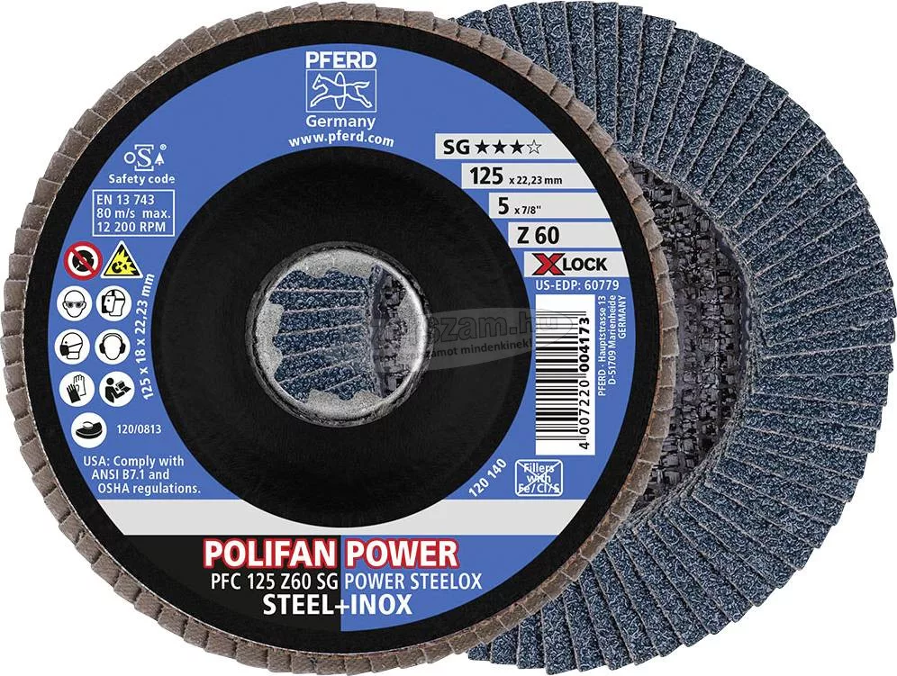 PFERD fogazott záralátét X-Lock. POLIFAN fogazott záralátétek - Teljesítménysorozat SG, Z SG POWER STEELOX, A POLIFAN Z SG POWER fogazott záralátét agresszív vágási teljesítményével és kiemelkedő élettartamával hat, ami azt jelenti, hogy rendkívül gazdaságos. A legjobb hagyományos csiszolókorong acélhoz. Előnyök: Gyors előrehaladás és maximális gazdasági hatékonyság az agresszív vágási teljesítmény révén. A legmagasabb szintű agresszivitás a teljes élettartam alatt. Kevesebb szerszámcsere a szerszám kiemelkedő élettartama miatt. X-LOCK tartóval a szerszám gyors és egyszerű cseréjéhez. Megmunkálható anyagok: acél, rozsdamentes acél (INOX), megmunkálási feladatok: hegesztési varratfeldolgozás, letörés, sorjázás. Csiszolóanyag: Zirconia corundum Z. Használati ajánlások: Acél felületre történő csiszolására is alkalmas.