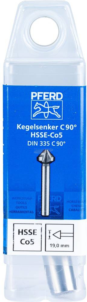 HSS süllyesztő HSSE DIN 335 C90 ° 19,0 mm. Nagy teljesítményű süllyesztőszerszámok 90 ° süllyesztőszöggel 90°-os süllyesztőcsavarokhoz különösen kemény és kemény anyagokhoz, például ötvözött és nagy szilárdságú acélhoz és rozsdamentes acélhoz (INOX). A 28 mm vagy annál nagyobb süllyesztő átmérõjű süllyesztők háromfelületi szárral rendelkeznek a megbízható nyomatékátvitel érdekében. Hosszú élettartam és hőálló kialakítás a Co tartalomnak köszönhetően.