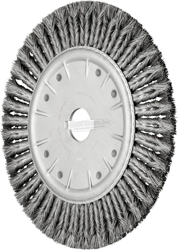 PFERD kerek kefe. Nagyon agresszív és stabil kefe, amely ellenáll a nagy mechanikai terheléseknek. Minden nehézkefés munkához álló és automatizált használatban, pl. B. sorjázás, alkalmas. Meghajtótípusok:. - Helyhez kötött gépek. Alkalmazás:. - sorjázás. - festék eltávolítása. - Rozsda eltávolítása. - Vízkőmentesítés. - Filéhegesztés feldolgozása. - Távolítsa el az oxid rétegeket. - Tiszta. - hegesztési varratfeldolgozás. - Gyökérvarrás feldolgozása. Anyag:. - öntöttvas. - Acél, öntött acél. A termék előnyei:. - Agresszív fogkefe hatás a drótfonatok nagy merevsége miatt. - Változtatható furatátmérőnek köszönhetően minden kereskedelmi forgalomban kapható álló hajtóműben és asztali köszörűgépben használható. - A legnagyobb gazdasági hatékonyság a leghosszabb élettartamnak és a megnövelt anyagleválasztásnak köszönhetően. - Magas munkavégzési kényelem az egyenletes futásnak köszönhetően, az ecset visszarúgása nélkül. - Alkalmas sarkok és élek megmunkálására, mivel a fonatok nem csavarodnak ki annyira.