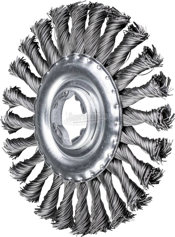 X-Lock kerek kefe. Kerek kefék, kötött; RBG; Agresszívan működő kefe. Alkalmas a fémszerkezetek nehéz fogmosására, például vízkőtelenítésre, portalanításra, sorjázásra, hegesztési varratok tisztítására és a ragasztómaradványok eltávolítására; Előnyök: Agresszív ecsetelő hatás a huzalfonatok nagy merevsége miatt. X-LOCK tartóval a gyors és egyszerű szerszámcseréhez. Használati javaslatok: Az optimális eredmény elérése érdekében használja nagy teljesítményű sarokcsiszolókon.