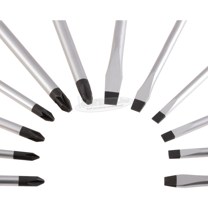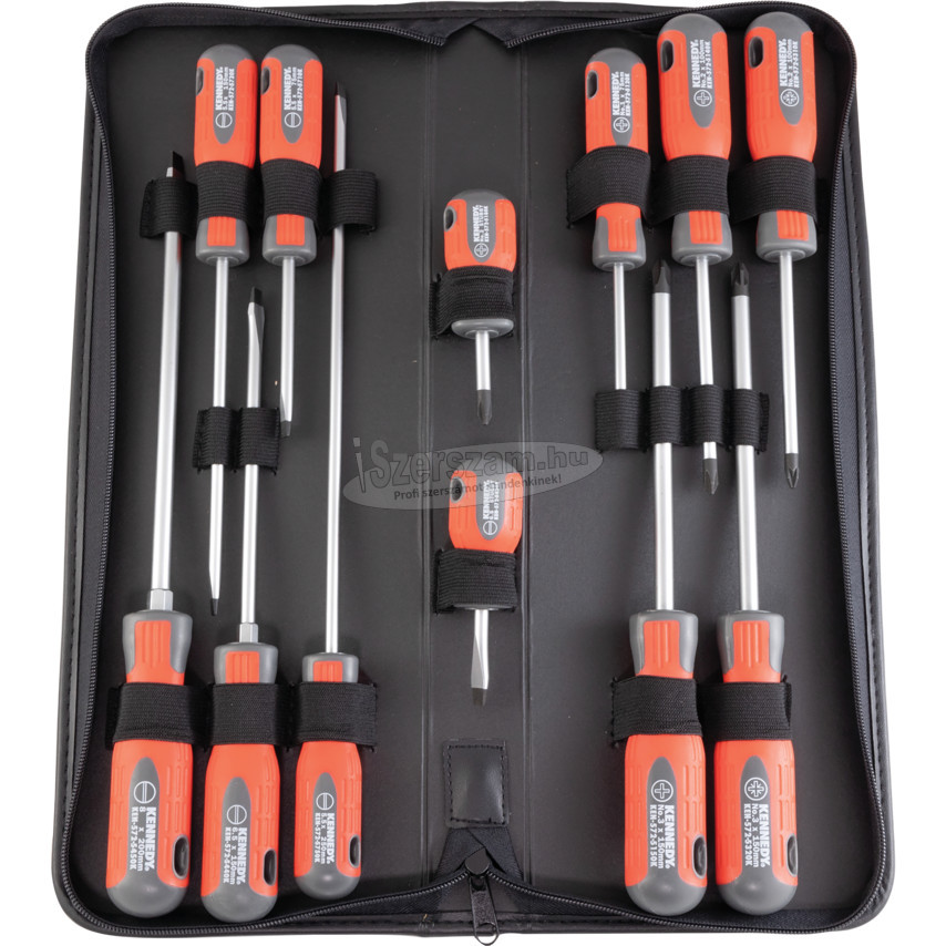 KENNEDY 12 DB-OS PRO-TORQ CSAVARHÚZÓ KÉSZLET KEN5726030K. Speciális króm-vanádium acélból készült penge mágneses éllel. Egyedülálló, háromszög keresztmetszetű, két komponensű erős markolat. A beépített puha zónák megkönnyítik a nyomaték átvitelét. Tárolást könnyítő akasztó lyukkal a markolat végén.