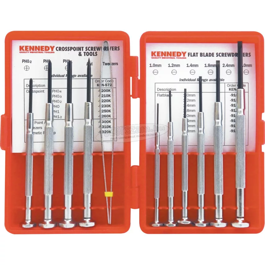 KENNEDY 11 DB-OS PRECÍZIÓS CSAVARHÚZÓ & SZERSZÁM KÉSZLET KEN5729040K. Minőségi választék kisméretú csavarhúzókókból. Kombinált készletek szerszámai szénacélból ké­szülnek (csipeszek rozsdamentes acélból). Csak behajtókat (csavarhúzó, hatszög, dugófej) tartalma­zó készletek pengéi nikkel-króm-molibdénnel ötvözött acélból készülnek.