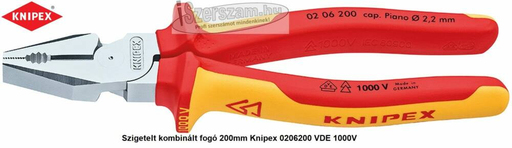 KNIPEX Szigetelt egyetemes fogó, kétkomponensű nyél 1000V 200mm 206 200. Szigetelt egyetemes fogó, erő, kétkomponensű nyél 1000V.