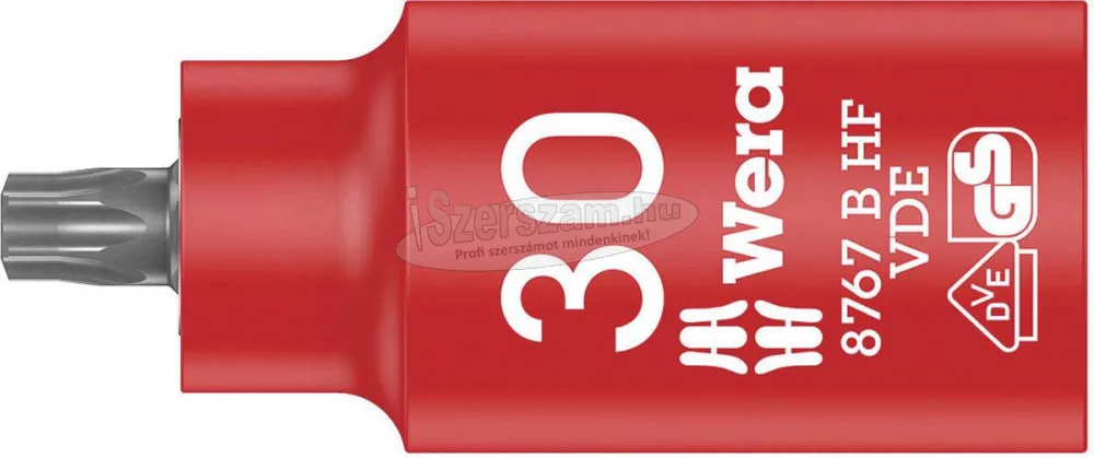 8767 B VDE HF TORX® Zyklop Bitnut, szigetelt, 3/8"hajtással, tartás funkcióval. VDE 3/8"bitnut tartó funkcióval a különösen kényelmes csavarozáshoz, csökkentve a csavarveszteség kockázatát a munkadarab adagolásakor. A sárga szigetelőmag révén fokozott biztonsággal, amely láthatóvá válik a külső piros VDE szigetelőréteg károsodása esetén. Darabban tesztelt szerszám IEC 60900 10000V feszültséggel, biztonságos működéshez jóváhagyott 1000 V feszültségnél Ez a szöveg gépi fordítással készült. Kivitel: Darabban tesztelt szerszám IEC 60900 10000V feszültséggel, biztonságos munkavégzésig 1000 V feszültségig. Rendkívül rövid és kompakt VDE bit-anya 3/8"a könnyű munka érdekében, még nagyon szűk helyeken is. Nagyobb biztonság a kétkomponensű szigetelés miatt, a sárga szigetelőmaggal a piros szigetelőréteg alatt. A tartó funkció biztonságosan rögzíti a csavarokat a szerszámon. A műanyag bevonat megvédi a felületeket a sérülésektől.