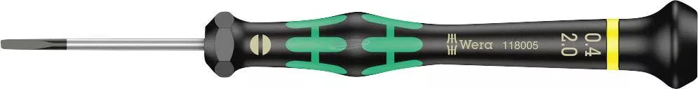 2035 0,4 x 2,0 x 40 mm Micro-Schr.-Dreh. Mikro csavarhúzó a finommechanikai csavarozásokhoz, Wera. A forgatható kupakon a kéz könnyen megtámasztható, az alatta lévő gyors csavarozási zóna pedig villámgyors csavarozást tesz lehetővé. Hatékonyságot növelő markolat kialakítás. Az erőátviteli zóna beépített lágy zónákkal gondoskodik a nagyobb húzó-és oldó nyomaték átviteléről. Precíziós zóna a finombeállítási munkáknál a megfelelő forgási szöghöz. Ez a szöveg gépi fordítással készült. Szállítás: 2035 0,4 x 2,0 x 40 mm.