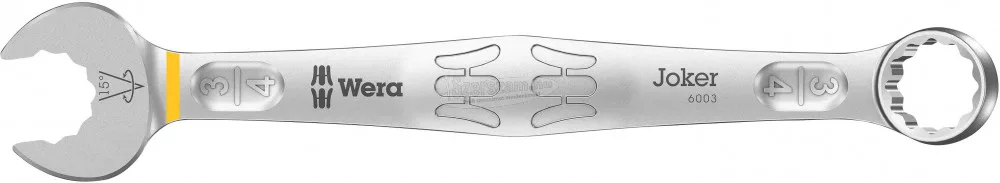 6003 Joker kombinációs csavarkulcs, birodalmi. Mivel a csavarozáshoz szükséges telepítési hely szűkül, szükségesek olyan szerszámok, amelyekkel a felhasználó sikeresen dolgozhat még ilyen helyzetekben is. A szűk telepítési helyekhez további rögzítési pontokra van szükség a szerszámhoz. Tehát a villáskulcsok úgy módosíthatók, hogy az eszköz alkalmazási lehetőségei növekedjenek? A száj 7,5 ° -kal elforgatott kombinációja és a kettős hatszög geometria megduplázza a rögzítési pontokat. Ha a kulcsot a csavarozás során 180 ° -kal többször elforgatják a hossztengely körül, négy rögzítési lehetőség van, és az anyákat vagy a csavarfejeket 15 ° -onként „be lehet csomagolni”. A Joker 6003 intelligens állkapocs-geometriájával jelentősen kibővíti a felhasználók körét zárt térben. A Joker 6003 minden forduló után automatikusan megtalálja a megfelelő kiindulási pontot. A vékony, de robusztus gyűrűs oldal a szerszámtengelyhez képest 15 ° -kal van szögben. A kiváló minőségű felületbevonat magas és tartós korrózióvédelmet biztosít. A Take it easy szerszámkeresővel: színkódolás méret szerint. Ez a szöveg gépi fordítással készült. Főbb jellemzők: Különösen alkalmas szűk helyekre. Karcsú, 15 ° -os szögű gyűrűs oldal. A szájban levő kis visszaszög 15 ° -onként megragadja a csavart. A Take it easy szerszámkeresővel: színkódolás méret szerint. A speciális állkapocs-geometria kiterjeszti az eszköz alkalmazási lehetőségeit. Szállítás: 6003 Joker kombinációs csavarkulcs, birodalmi, 3/4 " x 230 mm.