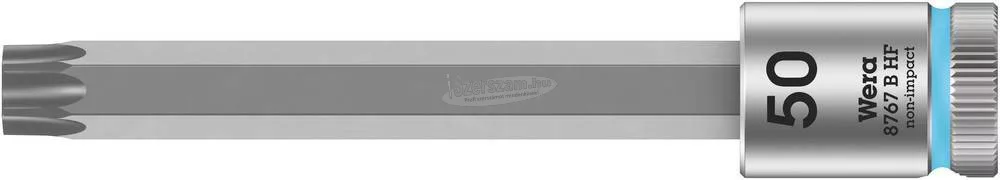 Zyklop 8767 B HF Torx foglalatkulcs T 50 x 100 mm. Zyklop foglalat (nem ütközéses) kézi vagy gépi működtetéshez tartó funkcióval a Torx csavarokhoz és a " Take it easy" szerszámkutatóhoz, színes méretkódolással - a kívánt szerszám könnyű és gyors megtalálásához. A hátsó sarokban történő gyűrés a nagy tapadásért, kézi működtetés mellett.