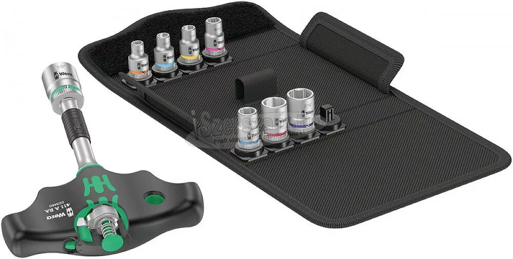 9 részes készlet robusztus textildobozban. 1 db T-fogantyús adaptercsavarhúzó 411 A RA racsnis funkcióval 1/4"-os aljzatokhoz. 8 foglalat, 1/4", Take it easy eszközkeresővel: méret szerinti színkódolás.(Ez a szöveg gépi fordítással készült.).